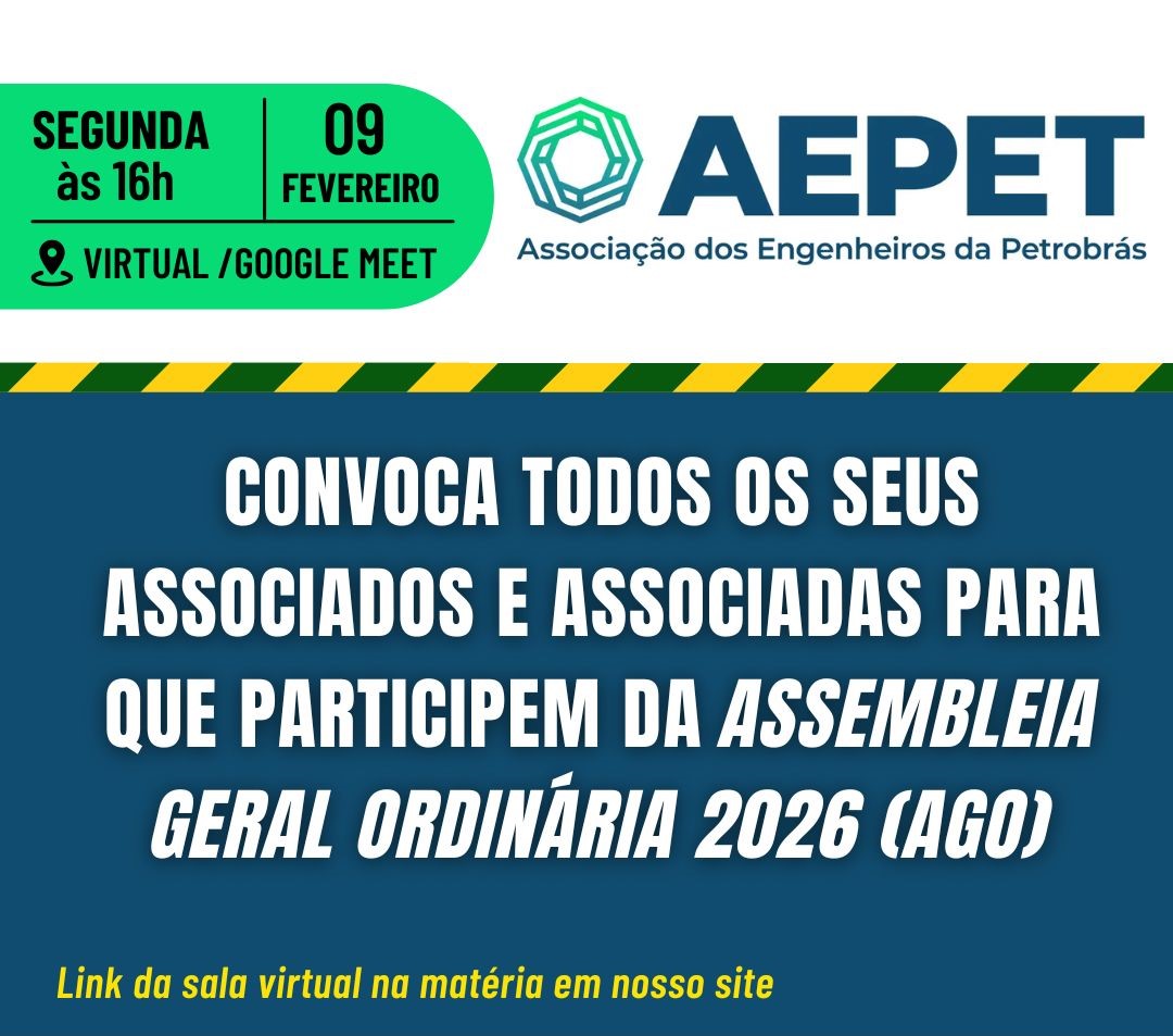 A Diretoria da AEPET convoca todos os seus associados e associadas para que participem da Assembleia Geral Ordinária (AGO), que será realizada na segunda-feira, 9 de fevereiro de 2026, a partir das 16h, em formato híbrido — presencial e virtual.