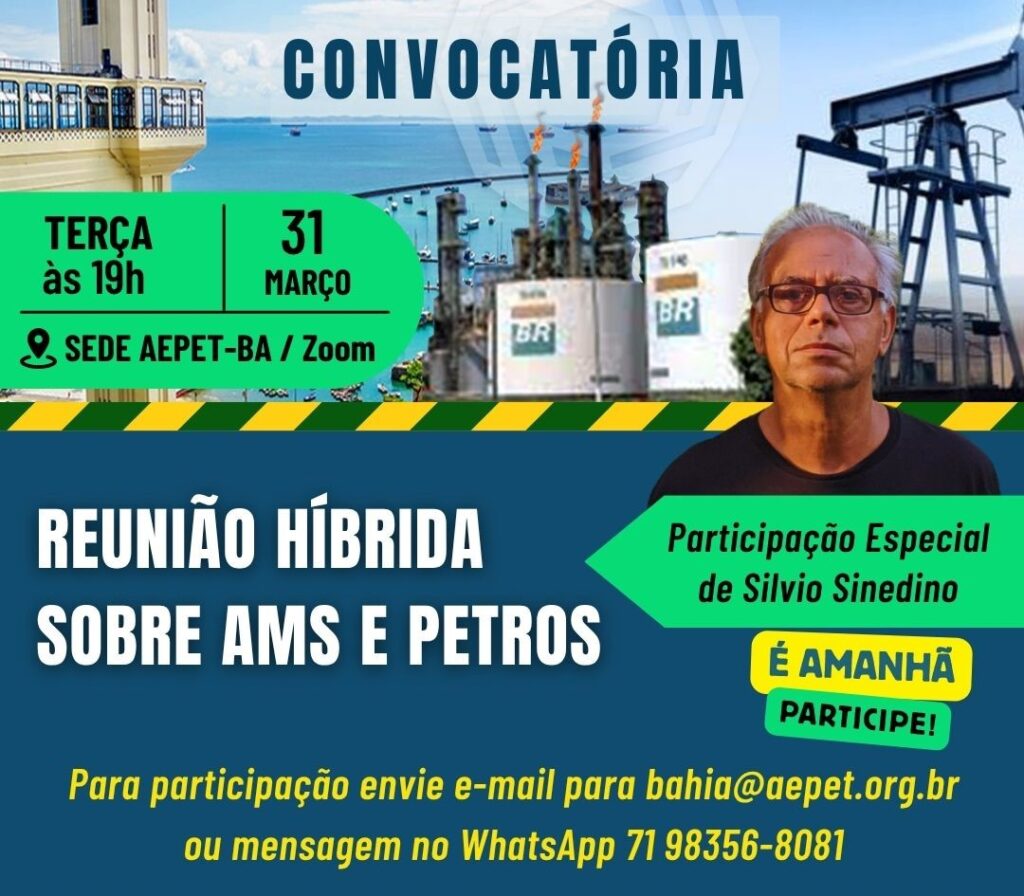 Com a participação do presidente do Conselho Fiscal da Petros, Silvio Sinedino, a AEPET-BA realizará sua 45ª reunião ordinária. O encontro, em formato híbrido (presencial e online), vai debater dois temas fundamentais para a categoria: AMS (Saúde Petrobrás) e a…