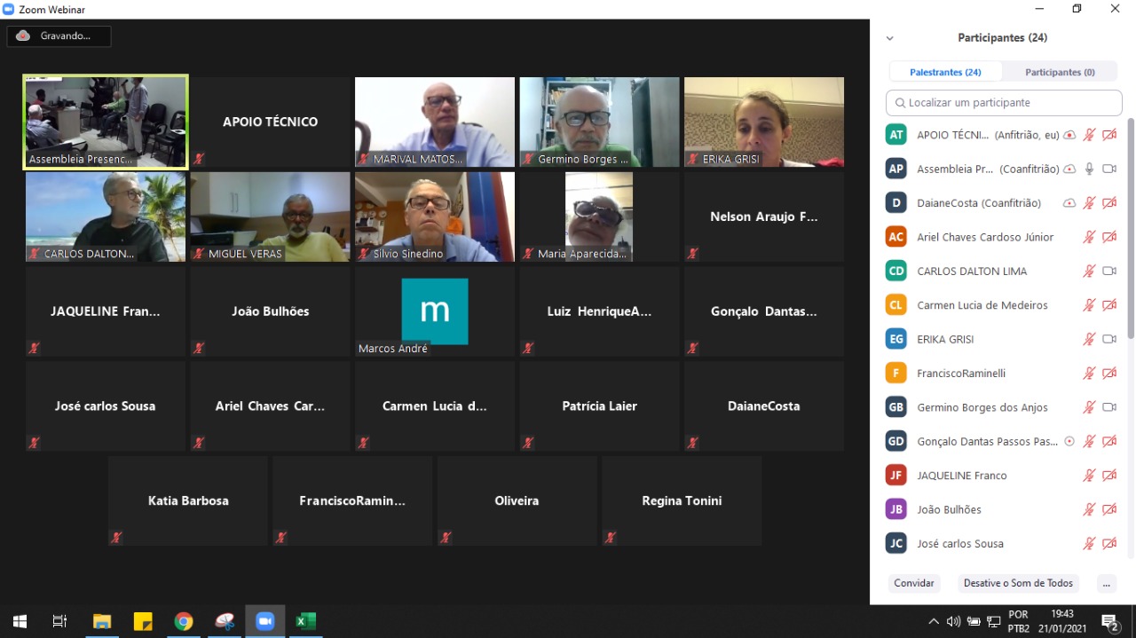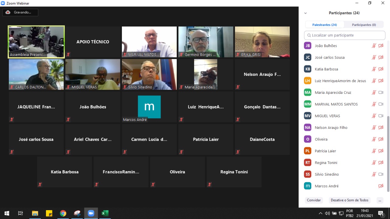 Na sala virtual, muitos associados e convidados participaram das duas assembleias ordinárias convocadas por meio de editais. Na primeira assembleia, o ex-diretor de Patrimônio, Vasco Menezes dos Anjos, exibiu de forma detalhada a prestação de contas de 2020 e a previsão orçamentária para 2021. Foram apresentados, ainda, os pareceres do conselho fiscal, que aprovou as duas apresentações, mas com ressalvas para o provisionamento deste ano. Os associados Geraldo Tonini e Railda Nascimento, se revezaram na presidência e secretaria geral das duas assembleias.