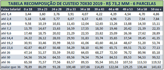 Veja a tabela de recomposição de custeio divulgado pela AMS