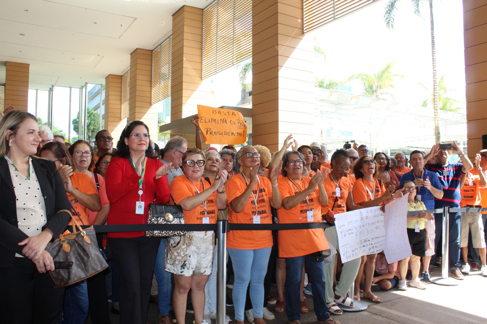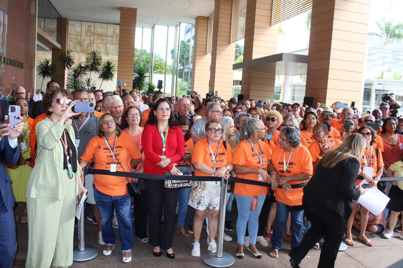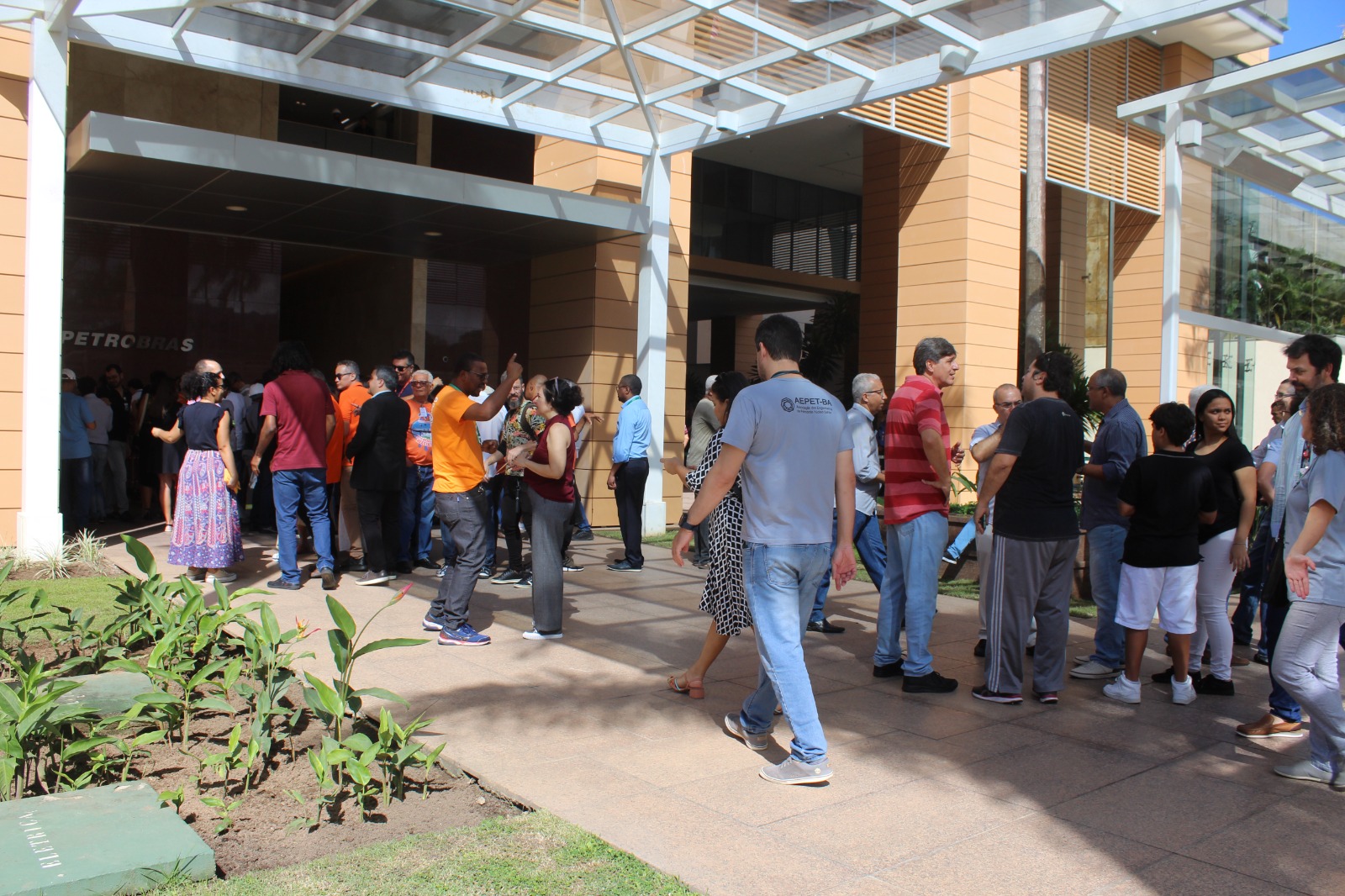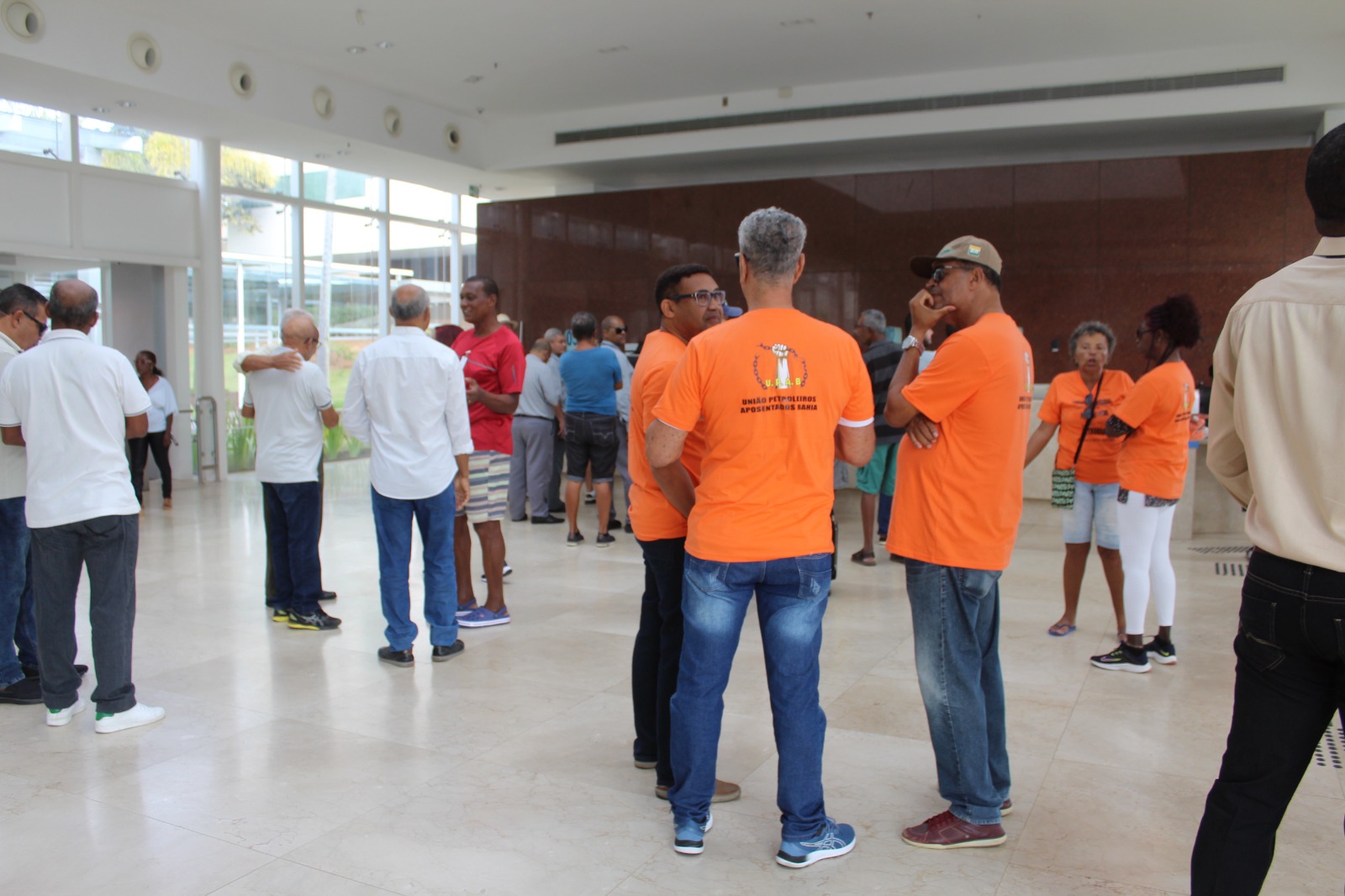 Centenas de aposentados e pensionistas, portando cartazes com as reivindicações mais urgentes da categoria: fim dos equacionamentos do fundo de pensão Petros, dos descontos abusivos da assistência médica AMS e a implementação de um posto avançado da Petros no Torre Pituba também participaram do ato. Foi a aposentada Lindomar que entregou um documento com as reivindicações ao presidente Prates.