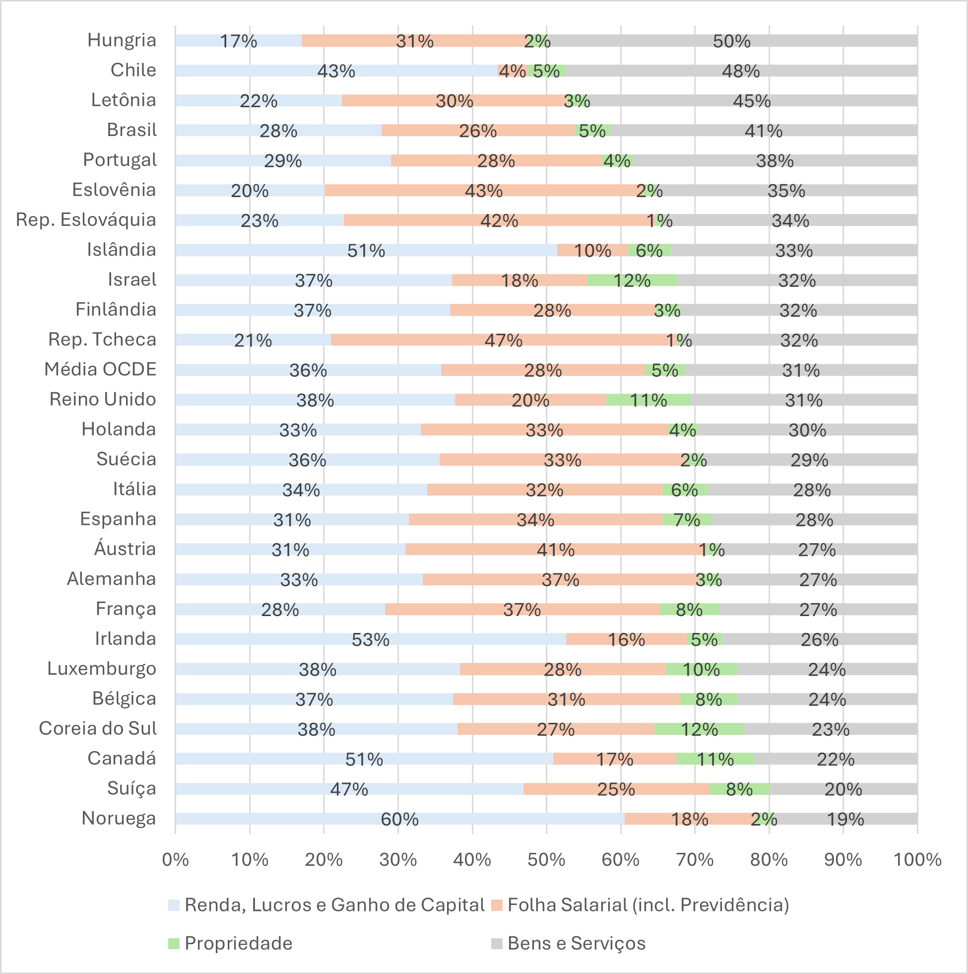 41% da carga tributária brasileira está baseada no consumo (ICMS, ISS, IPI, PIS, COFINS, CIDE e IOF), a quarta maior carga sobre o consumo dentre os países que a OCDE disponibiliza dados, e muito acima da média da própria OCDE, de 31%. Enquanto a carga tributária sobre a renda e o capital é a sexta menor, com apenas 28% do total da arrecadação, bem abaixo da média da OCDE, de 36%.