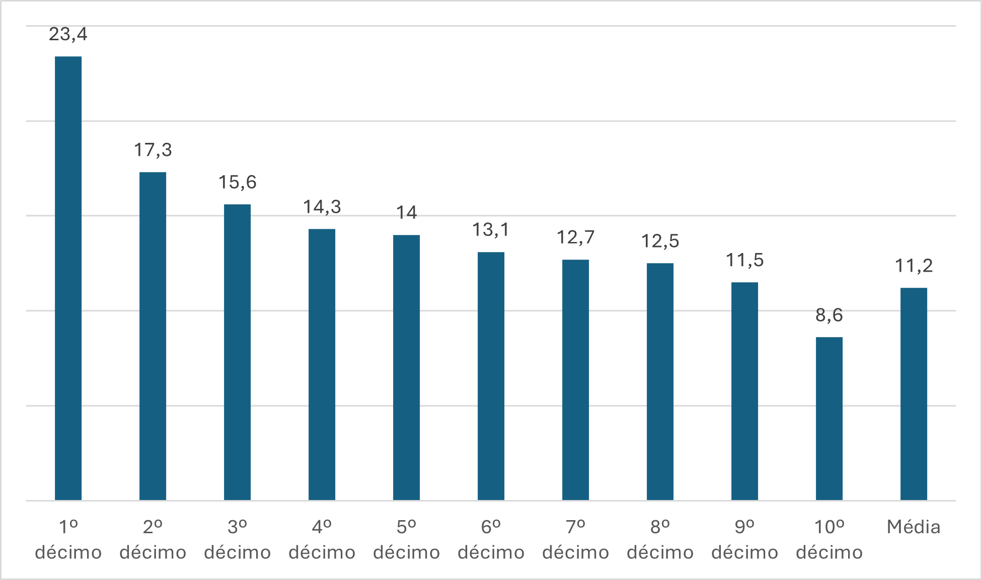 Com tributação excessiva no consumo e isenção nos dividendos, a carga tributária pesa muito mais sobre os pobres do que sobre os ricos. Como podemos ver no Gráfico 4, a carga tributária em relação à renda dos 10% mais pobres é de 26,4%, enquanto para os 10% mais ricos este percentual cai para 19,2%. Os 10% mais pobres no país pagam 7,2 pontos percentuais a mais de tributos do que a média, o que é claramente uma inversão da lógica de justiça tributária.